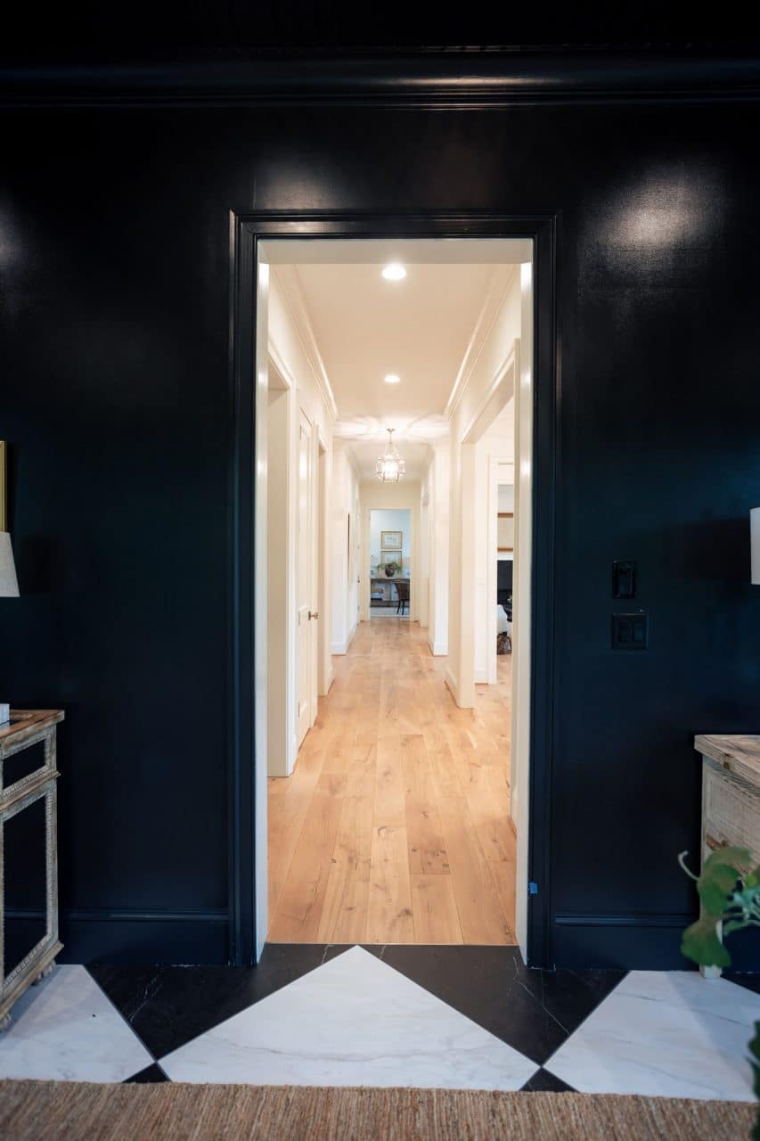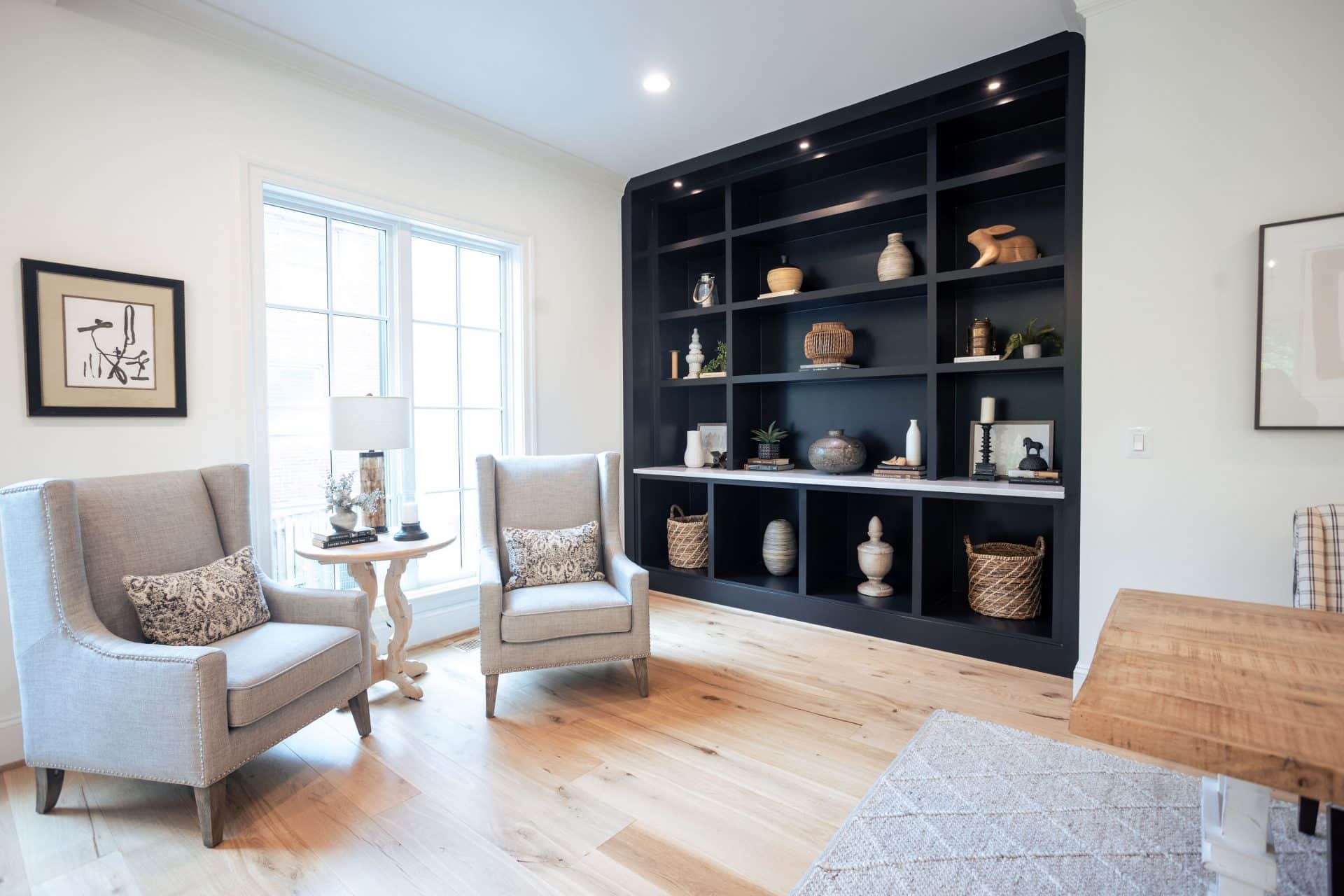 Notice the unique dark contrasts of this home which compliment the beauty of this engineered flooring. From the depth of the dark bookcases to the detail of the black railing, this home is a wonderful example of a great use of contrast.