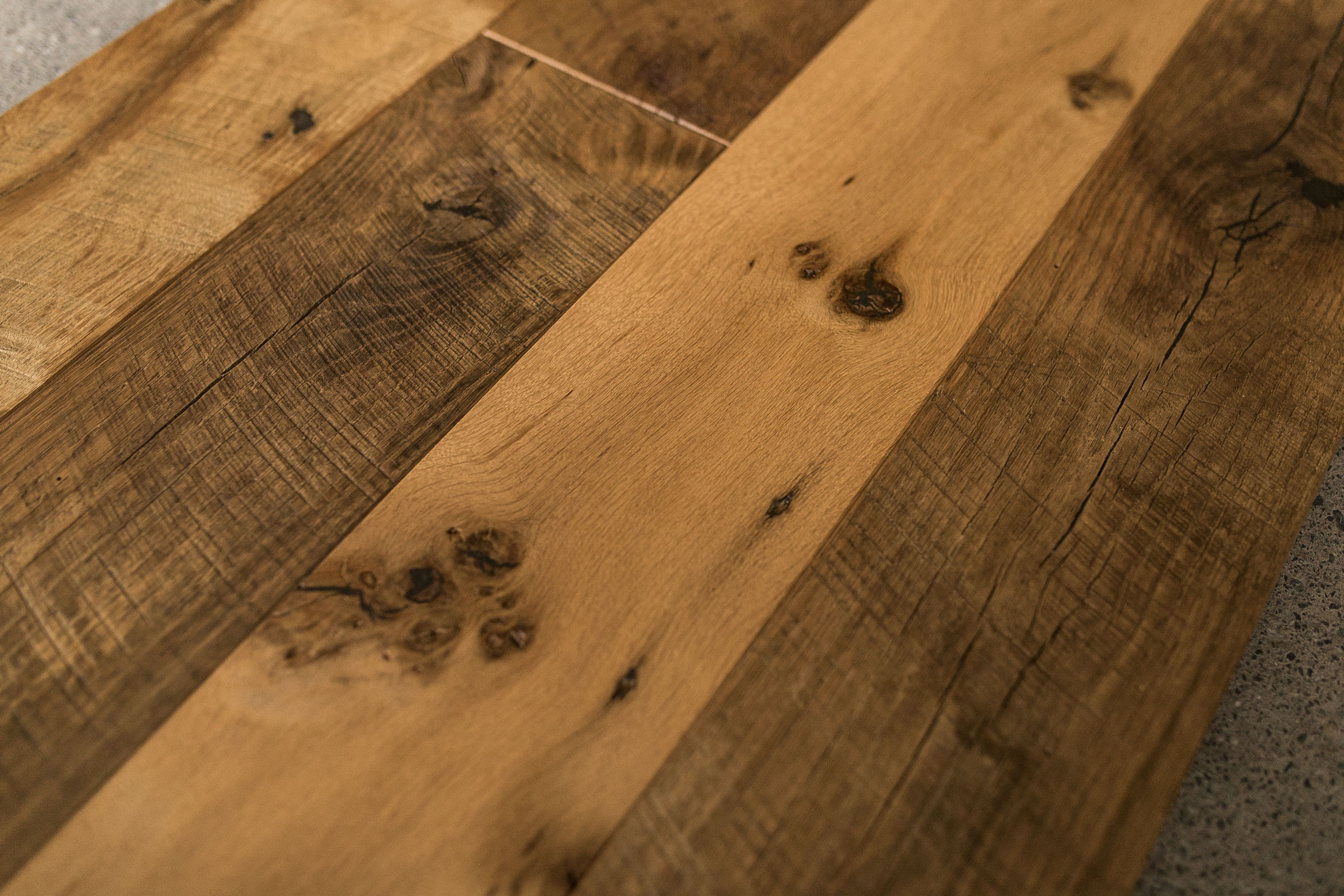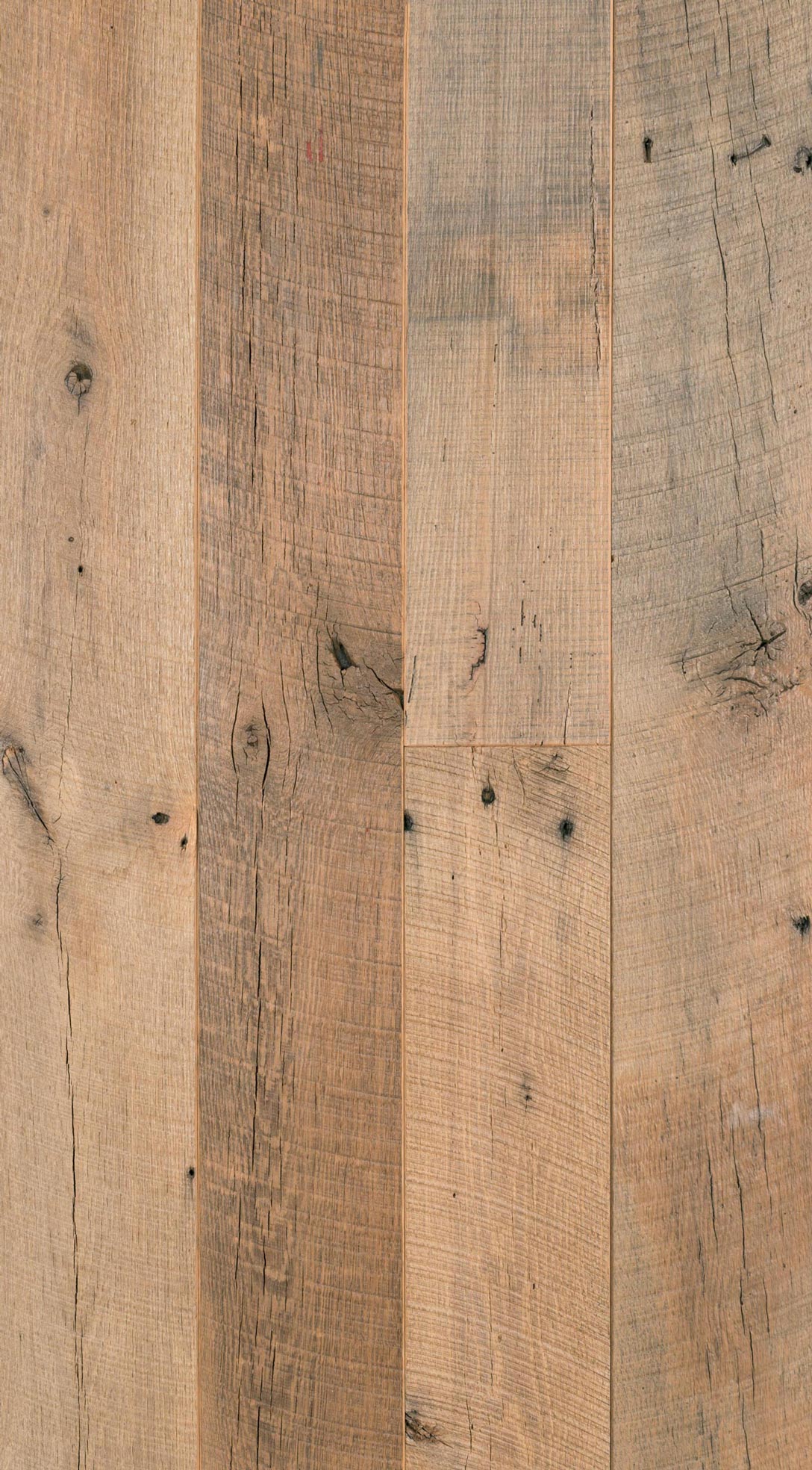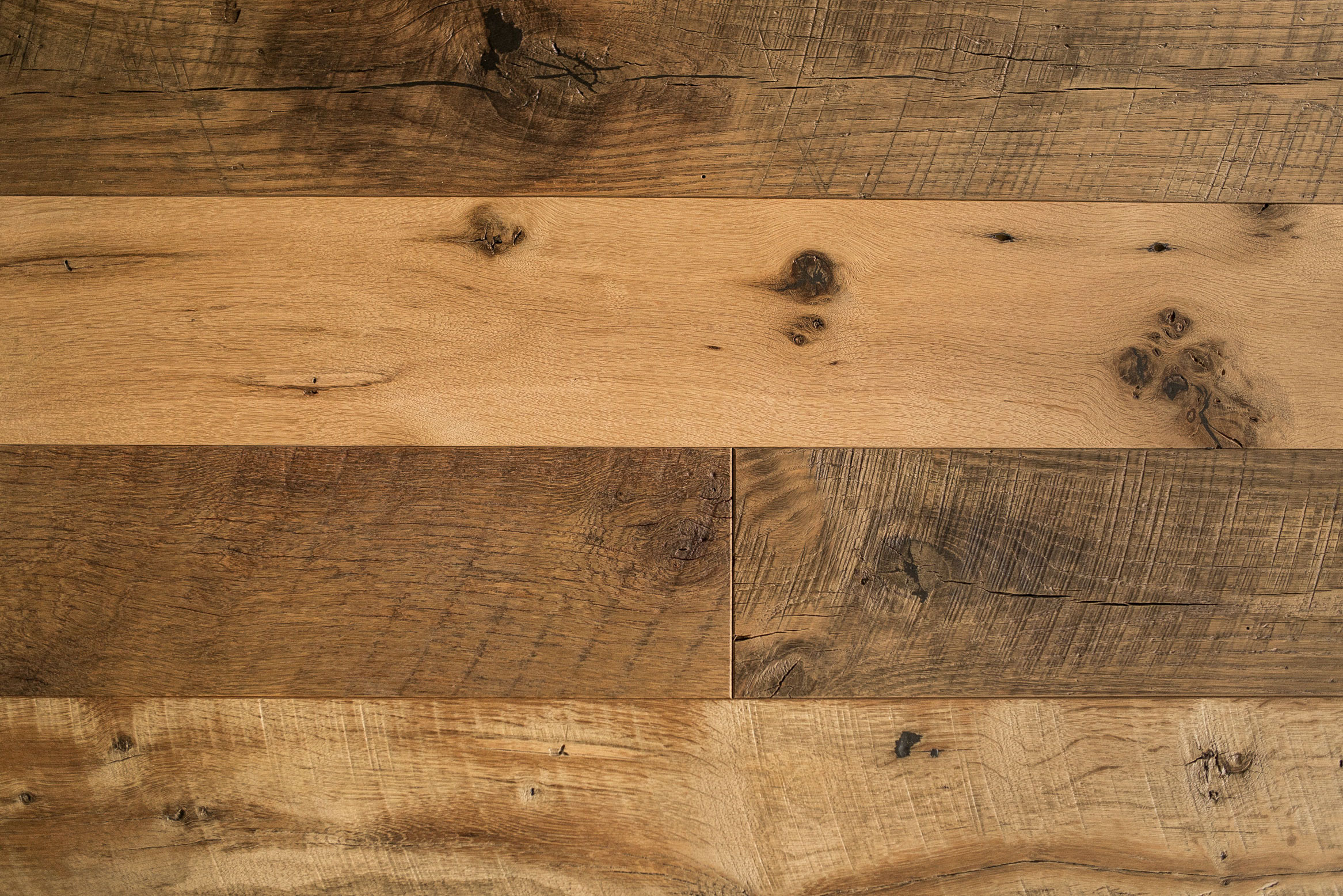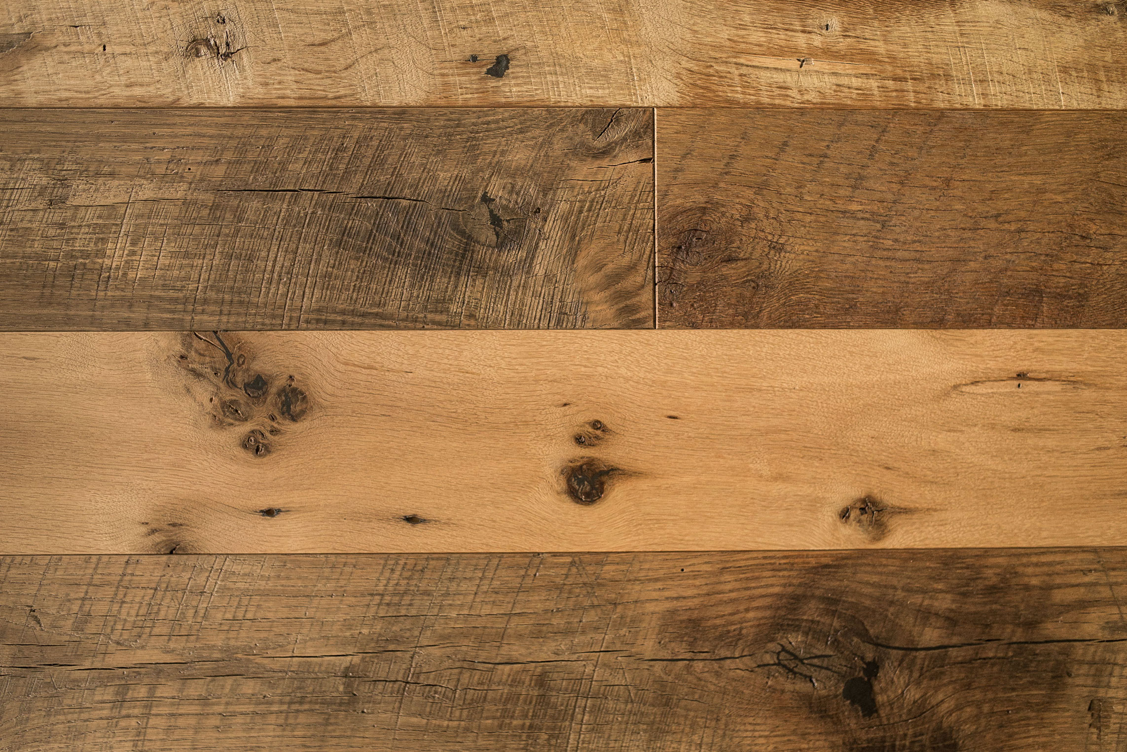 Made from the exterior faces of beams, decking, and siding boards our Antique Oak Distressed wood flooring gives any space a more rustic cozy feel. This grade displays worn character from the dark weathered patina, deep saw kerfs, and rough abuse the lumber received from years of heavy use.