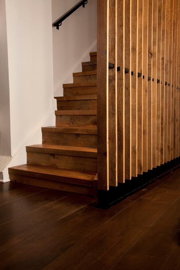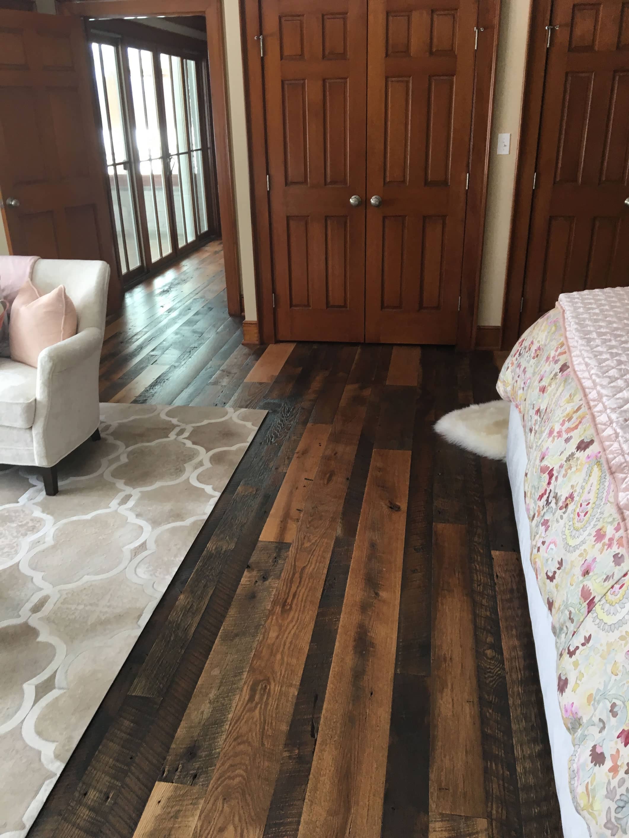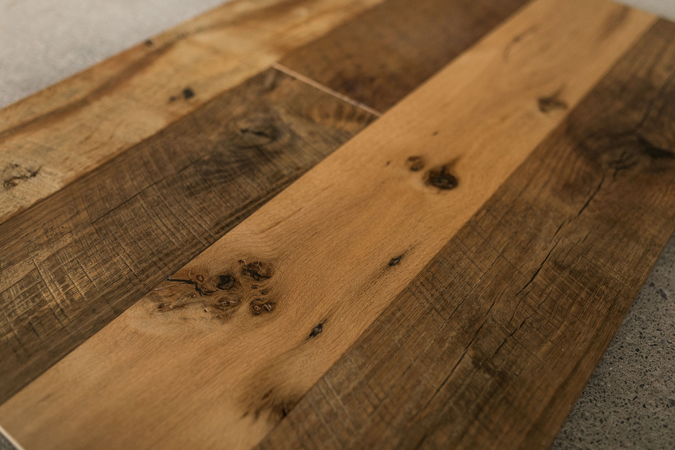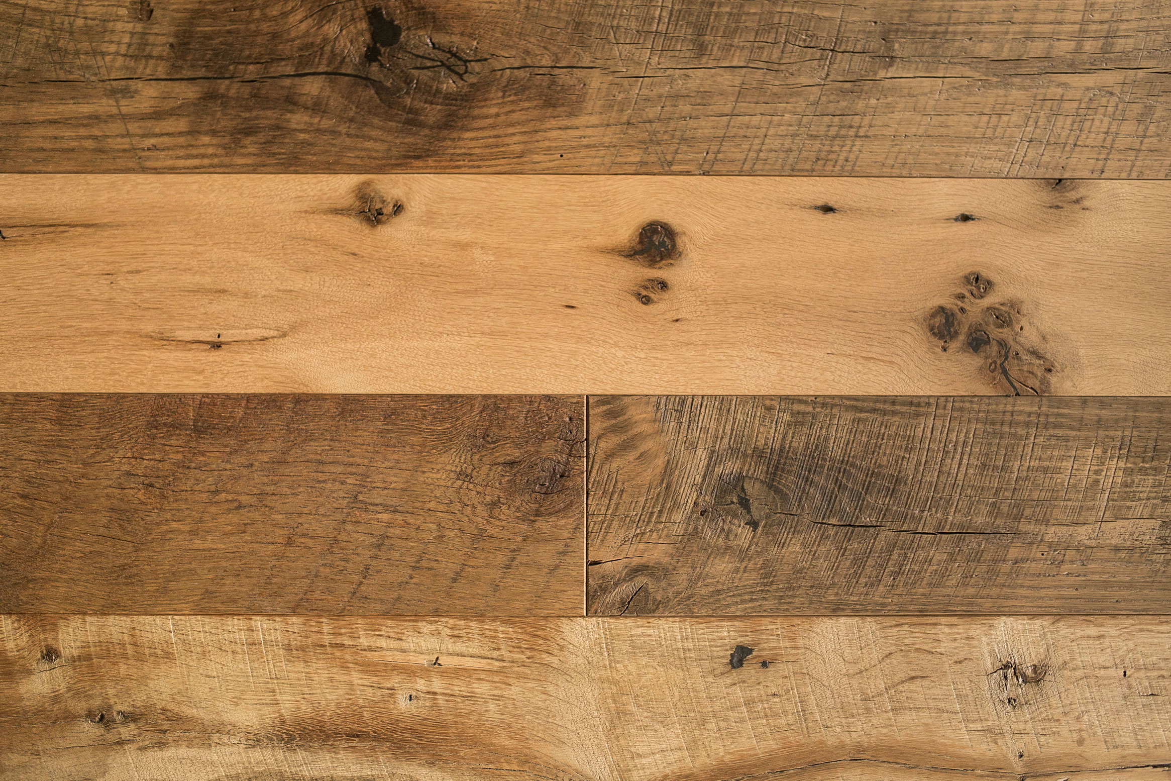 Made from the exterior faces of beams, decking, and siding boards our Antique Oak Distressed wood flooring gives any space a more rustic cozy feel. This grade displays worn character from the dark weathered patina, deep saw kerfs, and rough abuse the lumber received from years of heavy use.