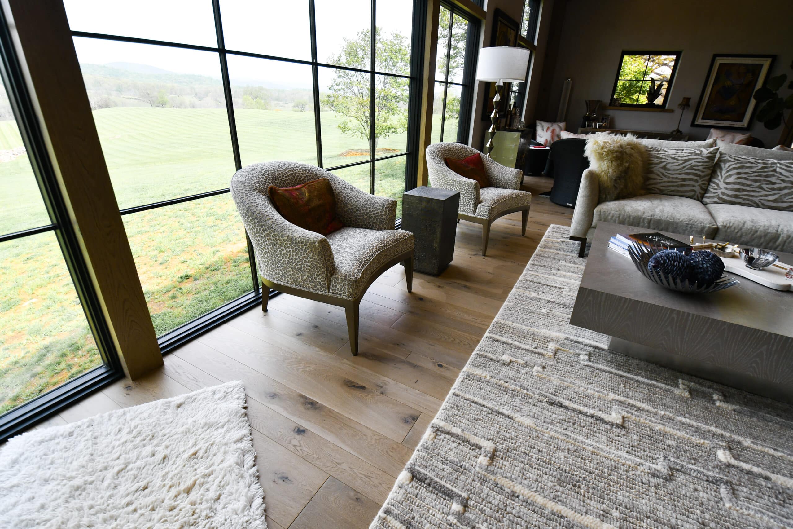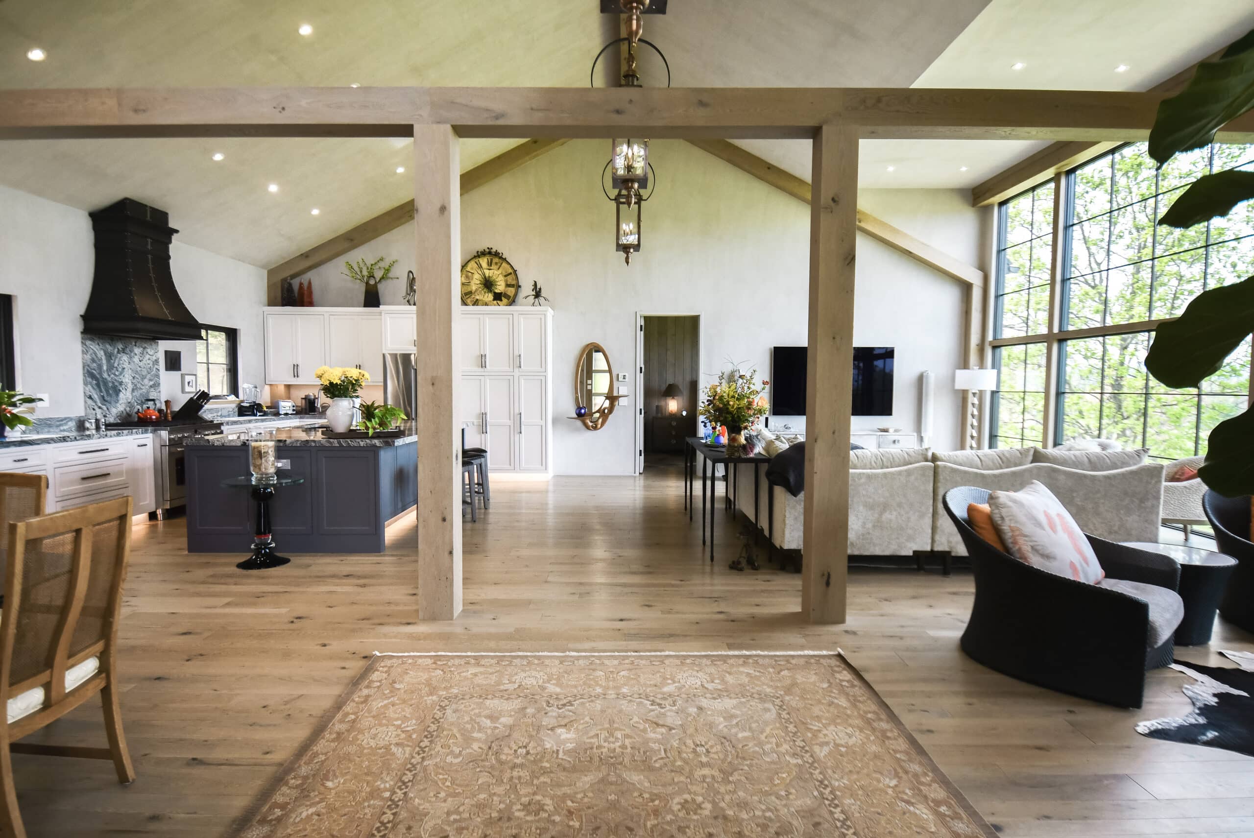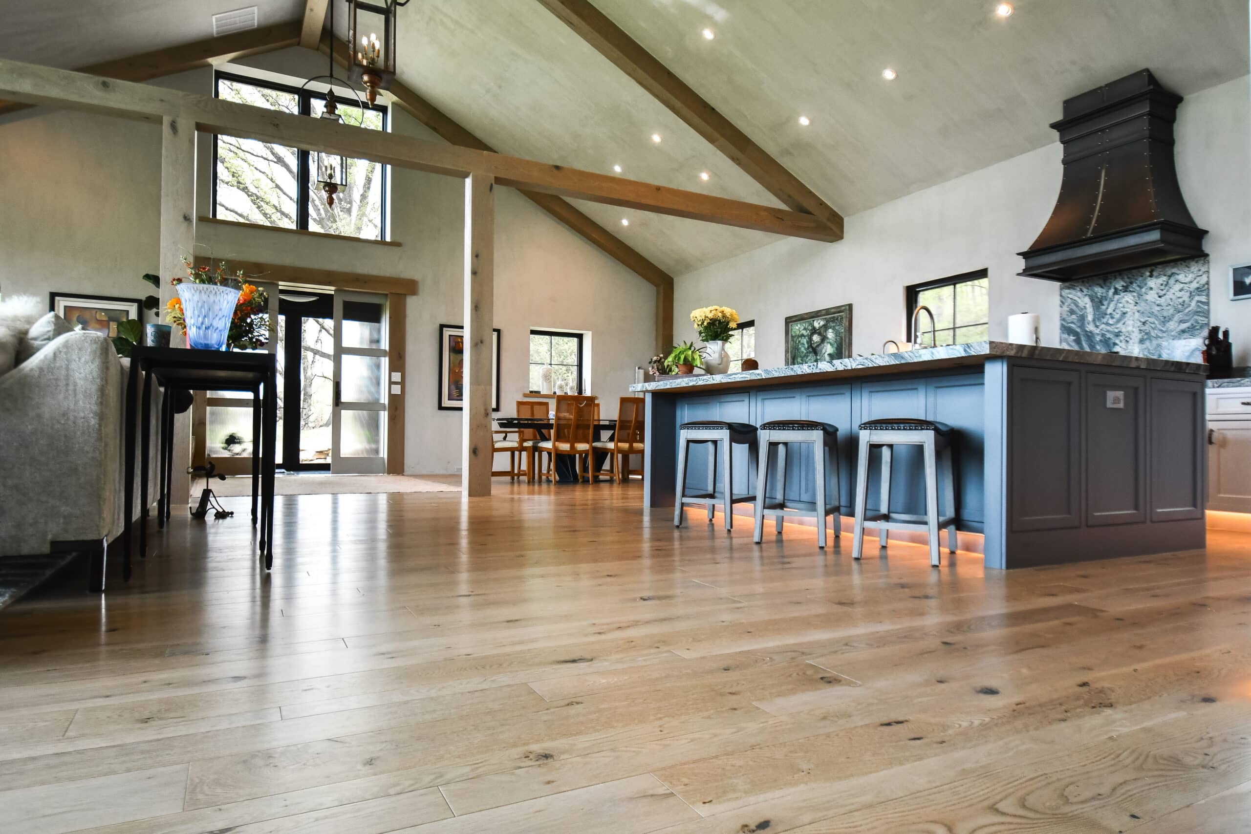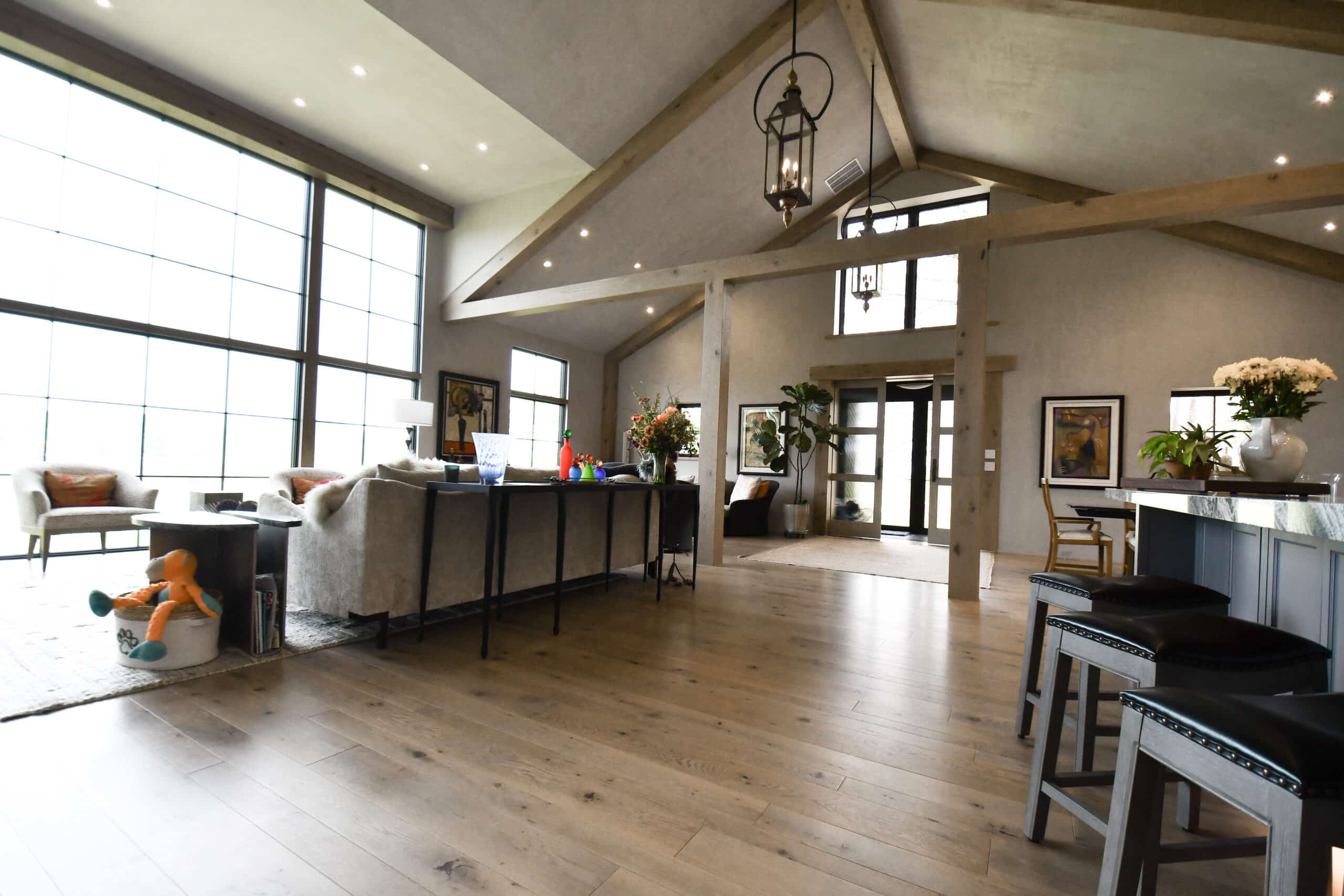 Clean lines, soaring beams, and modern simplicity define The Hazard Barn — a stunning new build in the heart of Fauquier County. This thoughtfully designed home pairs a dramatic timber frame with our mixed-width (3”–8”) White Oak, finished in the soft, inviting tones of our “Balance” finish. The result is a refined contrast that brings warmth and character to the open, modern layout without overpowering the architecture. Whether underfoot or overhead, the woodwork throughout speaks to a vision rooted in harmony, craftsmanship, and timeless design.