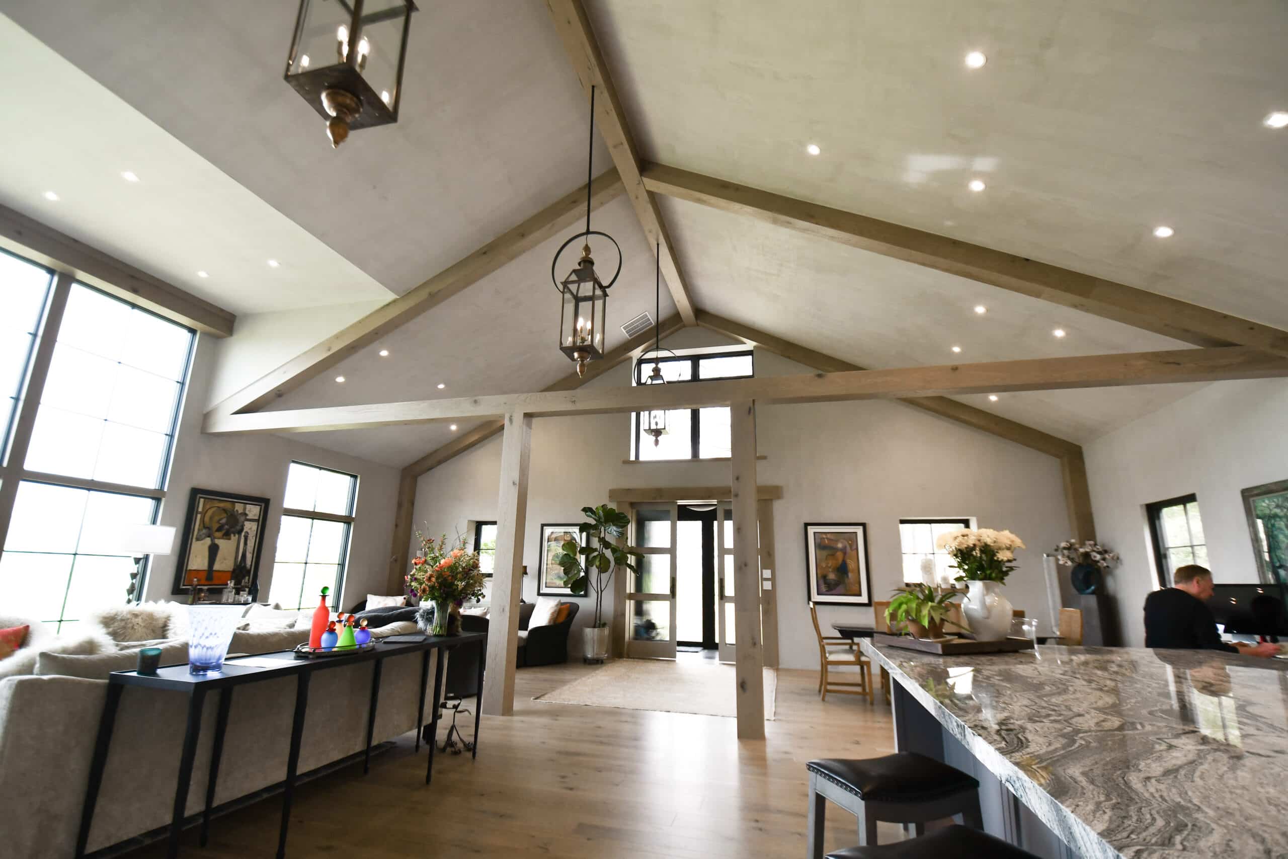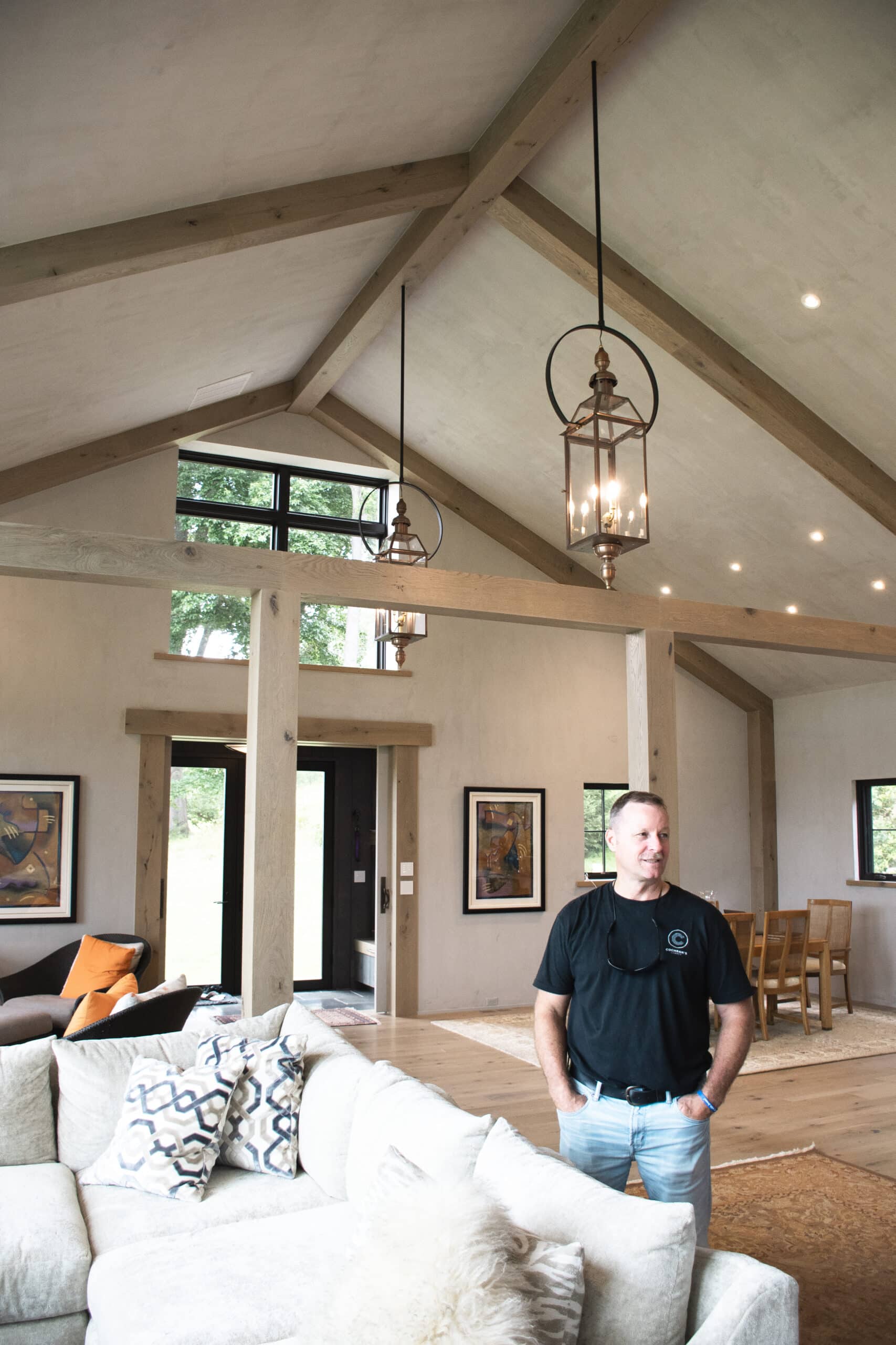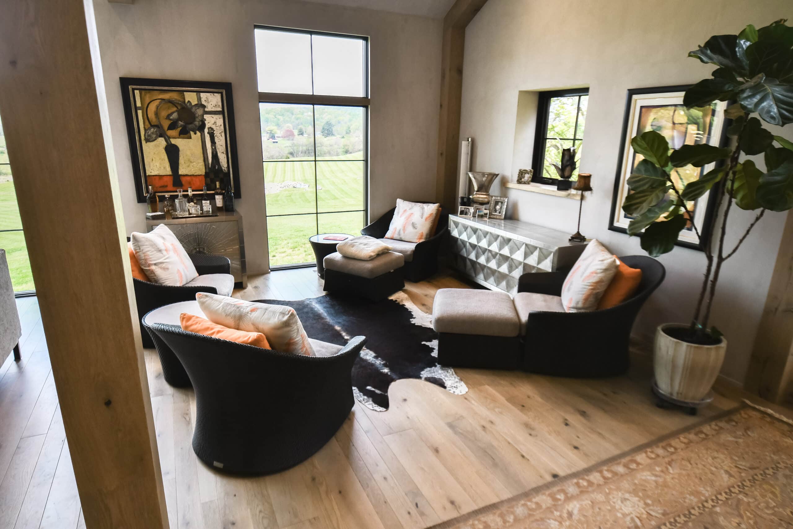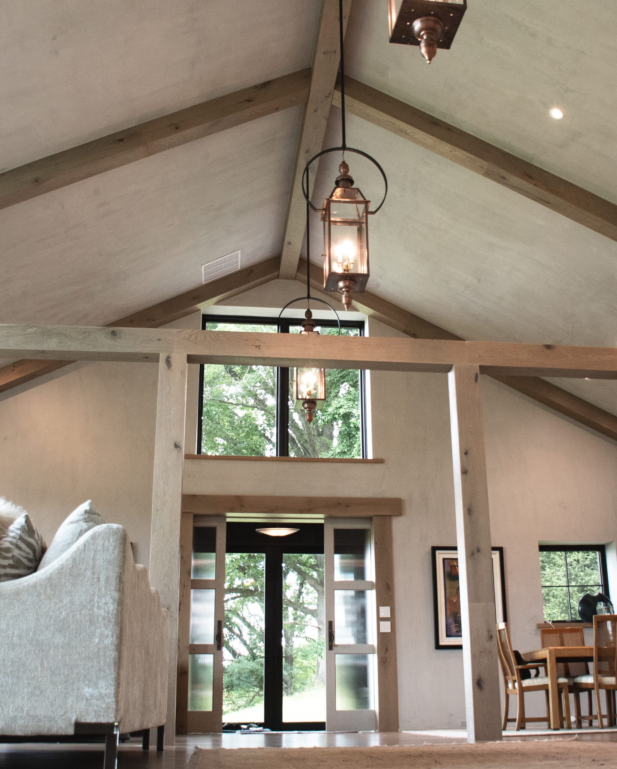 Clean lines, soaring beams, and modern simplicity define The Hazard Barn — a stunning new build in the heart of Fauquier County. This thoughtfully designed home pairs a dramatic timber frame with our mixed-width (3”–8”) White Oak, finished in the soft, inviting tones of our “Balance” finish. The result is a refined contrast that brings warmth and character to the open, modern layout without overpowering the architecture. Whether underfoot or overhead, the woodwork throughout speaks to a vision rooted in harmony, craftsmanship, and timeless design.