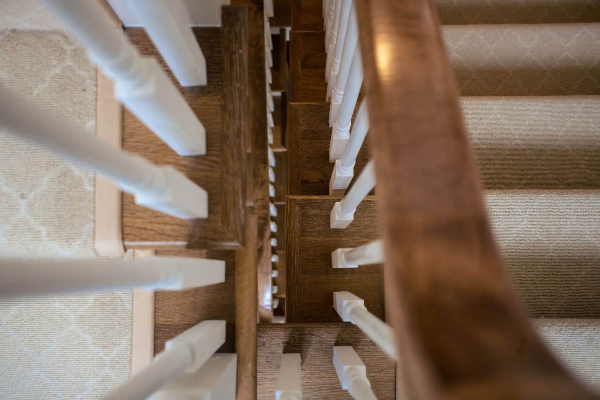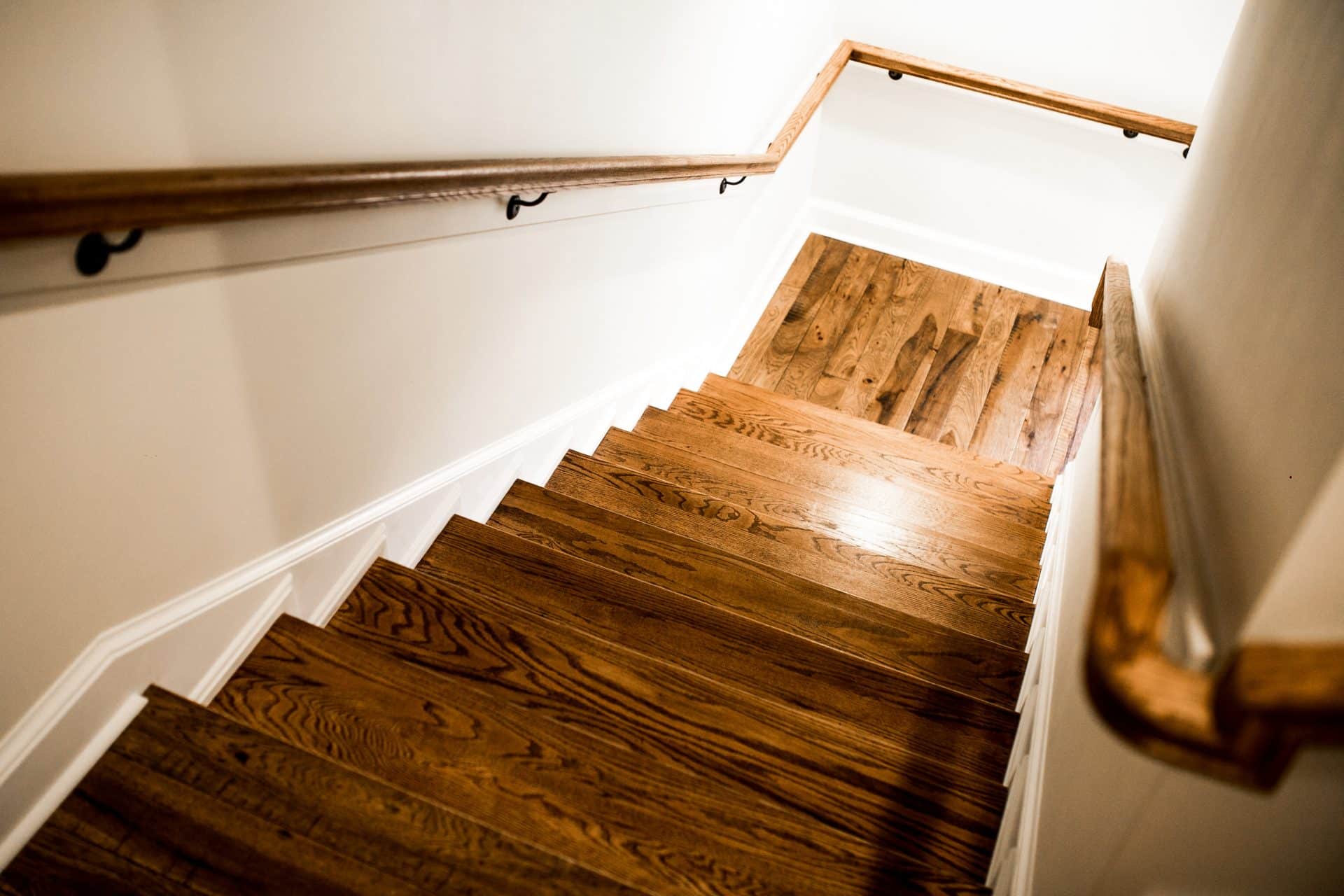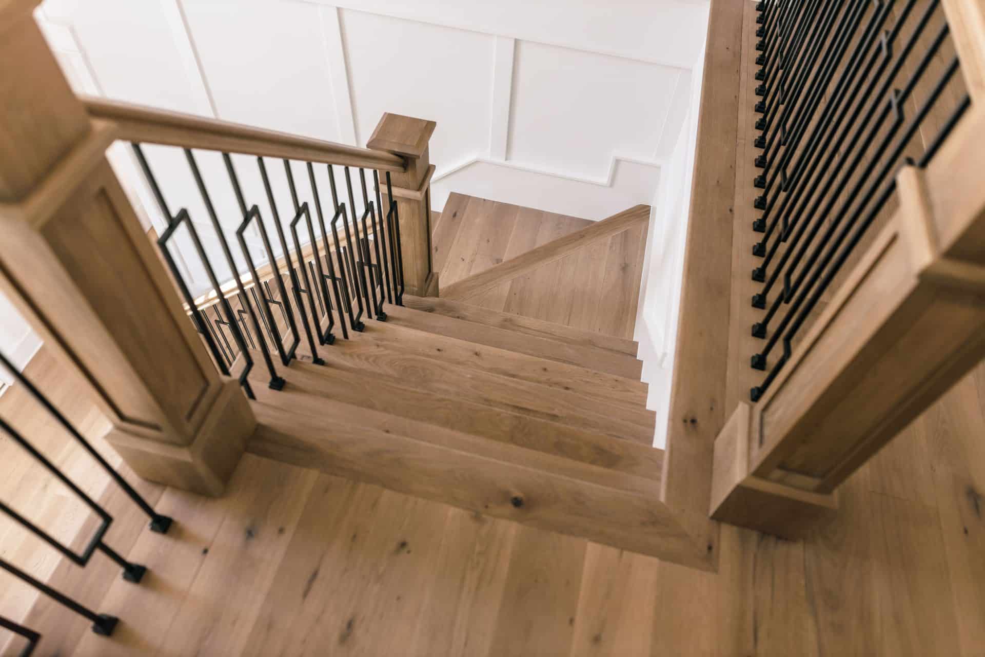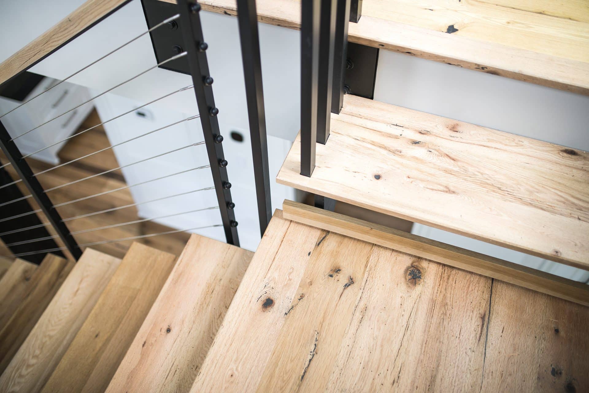 Light treads contrast dark floors. Open risers and glass railings seen from the side. The same staircase (seen here from the front) is a focal point in this open-concept home. Custom iron-work juxtaposed with warm wood tones. A corporate installation with reclaimed paneling behind. Newel post and treads that complement the flooring. Traditional lines and colors never go out of style. Floor to ceiling wall paneling and a glossy, black banister make a bold statement. Beautiful details from above. The flooring, treads, risers, and railing tell a unified story. Continuing flooring up the stairway and into the upper level creates visual unity. A dramatic curved staircase in deep wood tones. Consider lighting for dimly lit staircases. This client mirrored the main staircase in a smaller, back stairway. Mixed materials, like wood and iron, add texture. Laying boards in different directions on stair treads and landings adds interest. Traditional millwork details add character to this stairway. A striking turned newel post, curved banister, and custom runner make this stairway anything but boring. Varying colors and tones add depth to this traditional entryway. The rich tones and depth of the wood make this staircase unique. Balusters don’t have to be wood! This modern staircase uses metal cords to add interest.