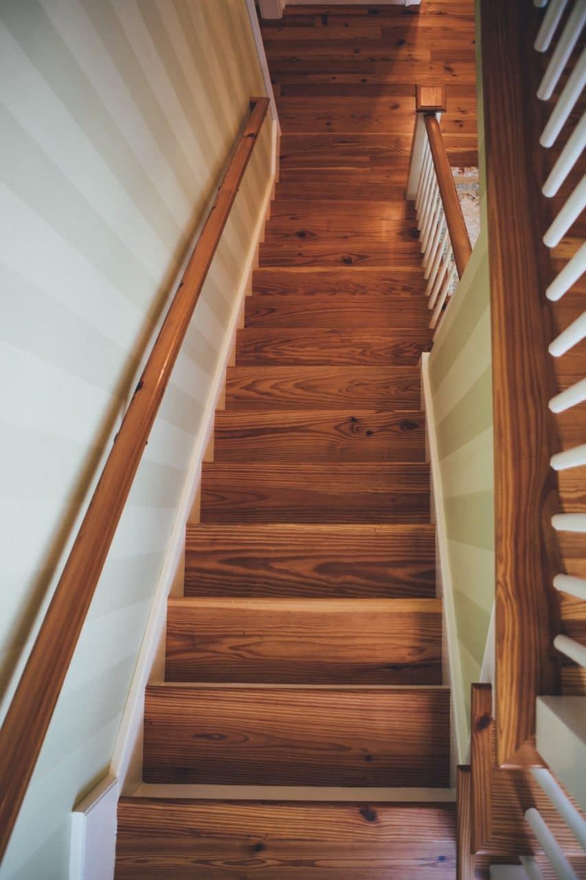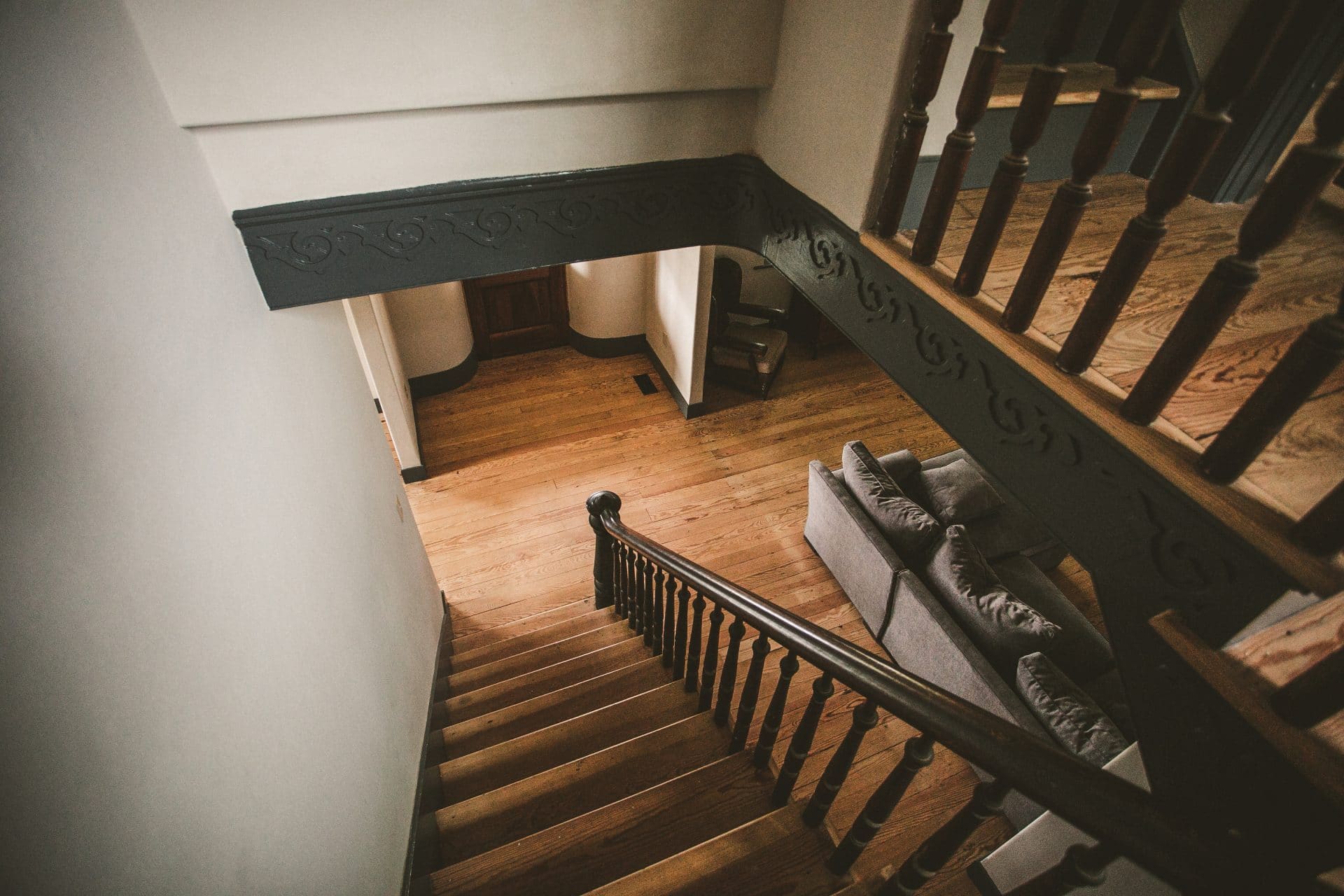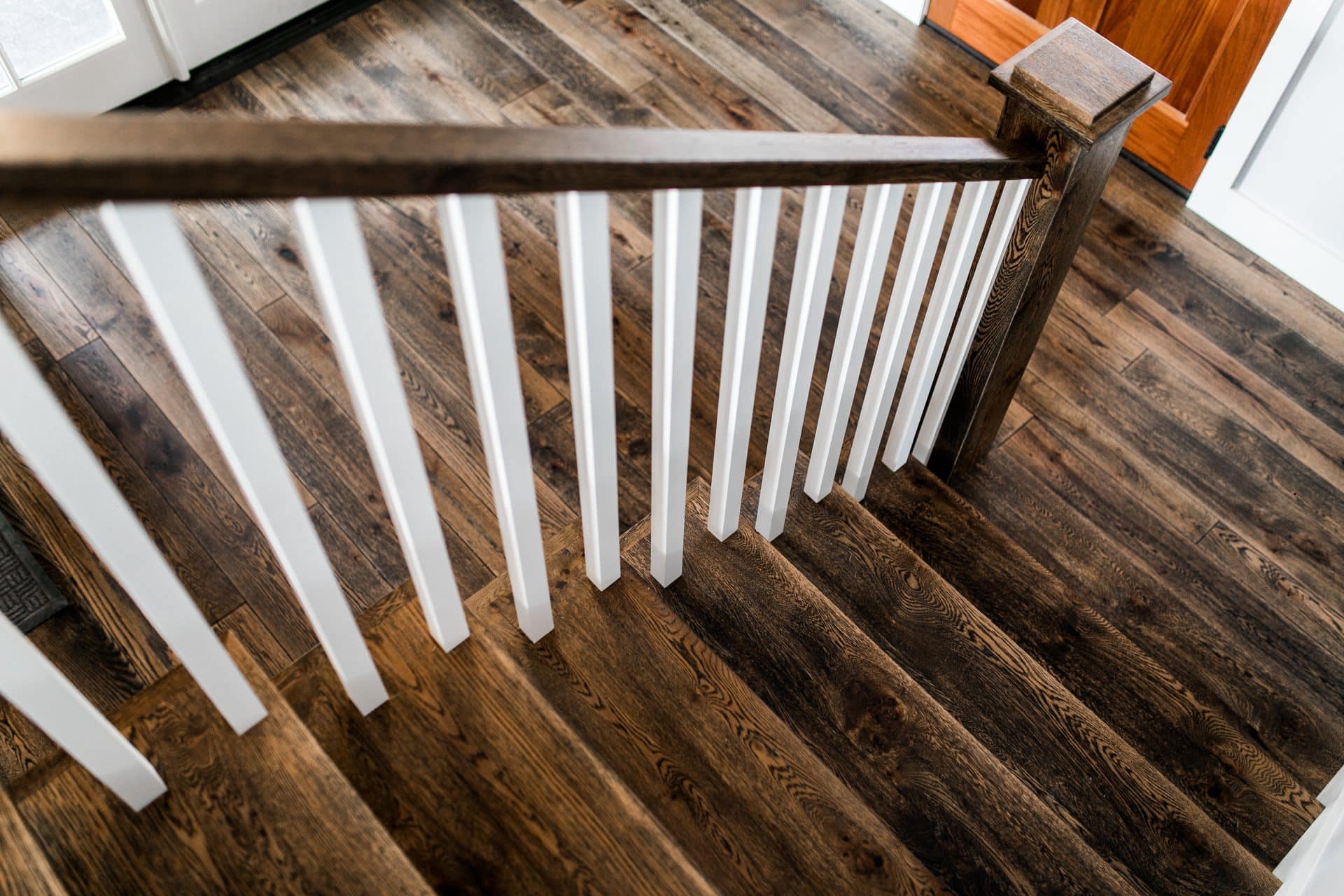 Light treads contrast dark floors. Open risers and glass railings seen from the side. The same staircase (seen here from the front) is a focal point in this open-concept home. Custom iron-work juxtaposed with warm wood tones. A corporate installation with reclaimed paneling behind. Newel post and treads that complement the flooring. Traditional lines and colors never go out of style. Floor to ceiling wall paneling and a glossy, black banister make a bold statement. Beautiful details from above. The flooring, treads, risers, and railing tell a unified story. Continuing flooring up the stairway and into the upper level creates visual unity. A dramatic curved staircase in deep wood tones. Consider lighting for dimly lit staircases. This client mirrored the main staircase in a smaller, back stairway. Mixed materials, like wood and iron, add texture. Laying boards in different directions on stair treads and landings adds interest. Traditional millwork details add character to this stairway. A striking turned newel post, curved banister, and custom runner make this stairway anything but boring. Varying colors and tones add depth to this traditional entryway. The rich tones and depth of the wood make this staircase unique. Balusters don’t have to be wood! This modern staircase uses metal cords to add interest.