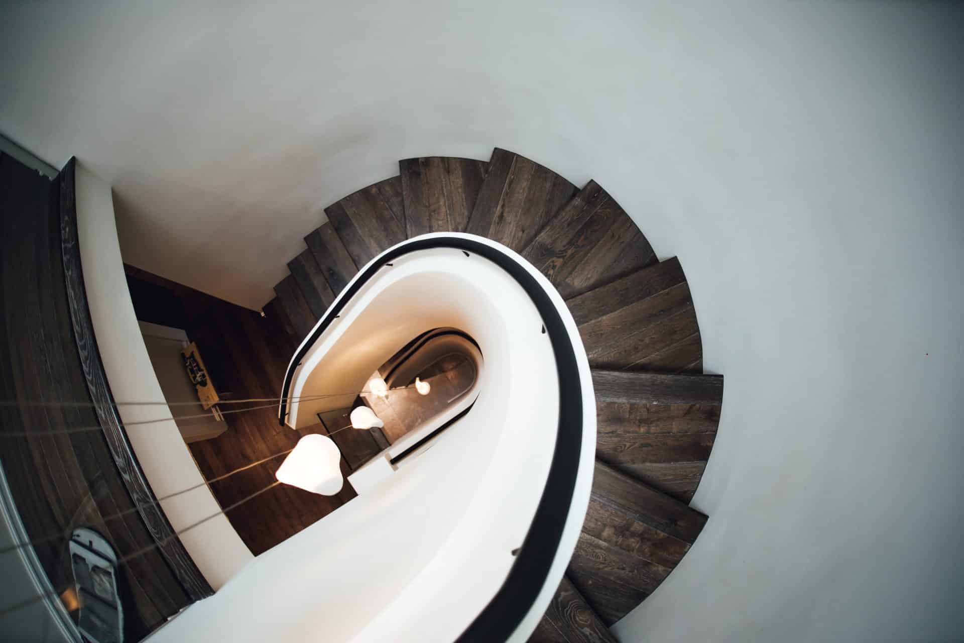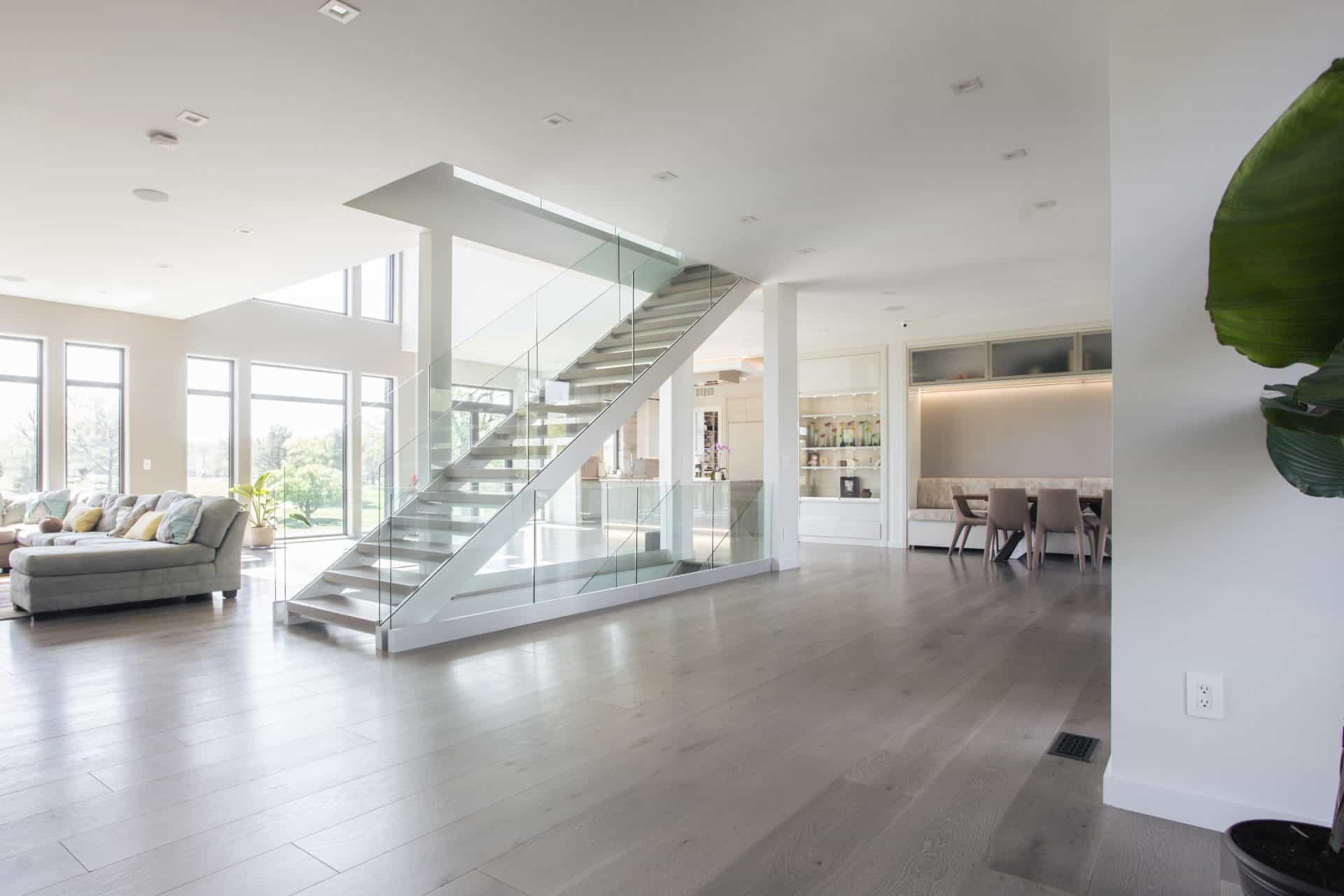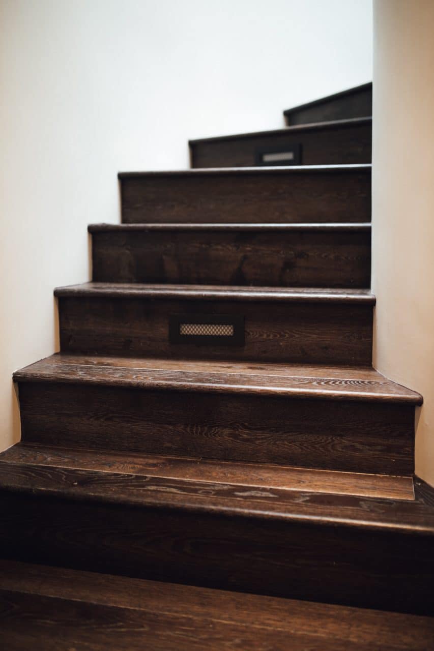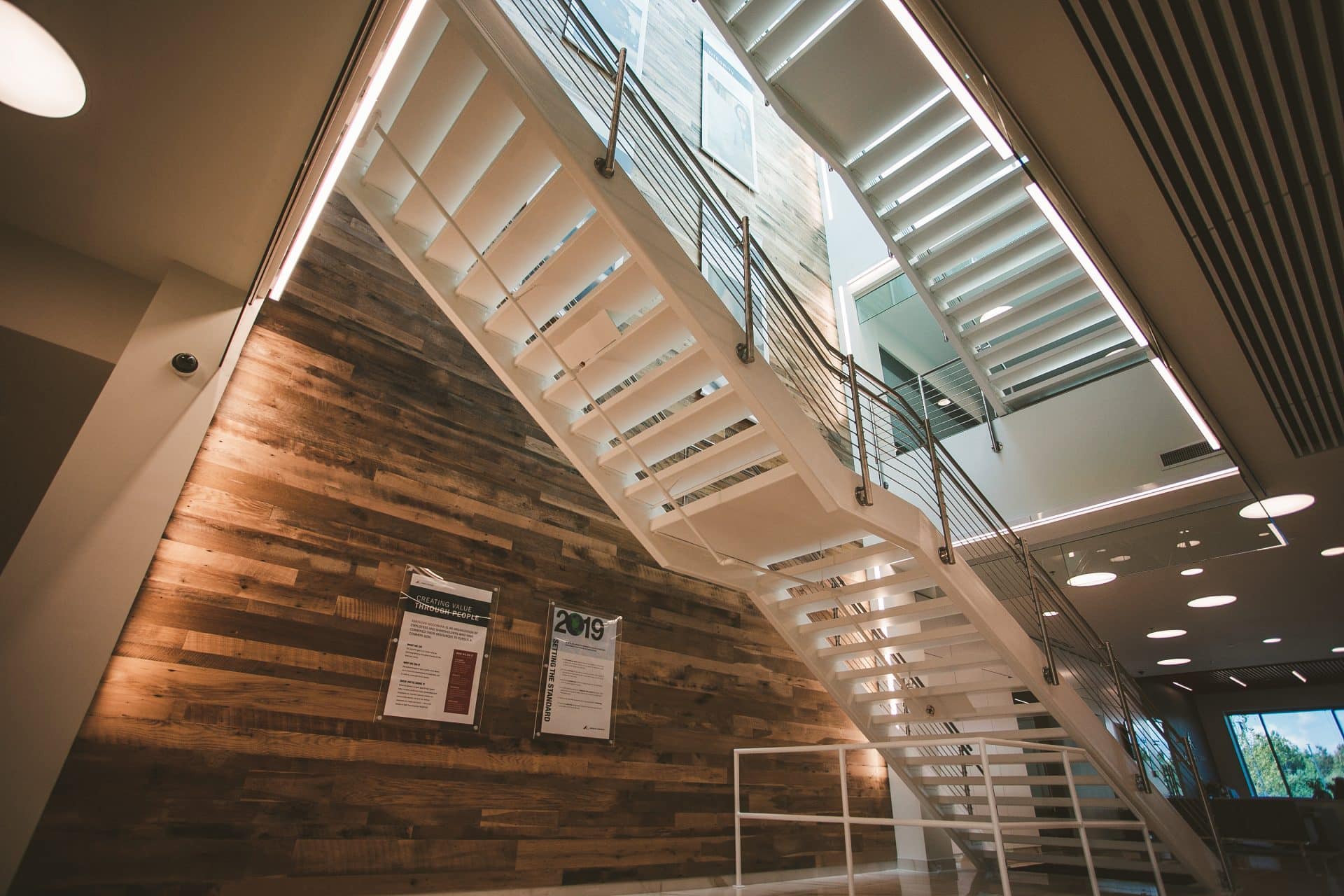 Light treads contrast dark floors. Open risers and glass railings seen from the side. The same staircase (seen here from the front) is a focal point in this open-concept home. Custom iron-work juxtaposed with warm wood tones. A corporate installation with reclaimed paneling behind. Newel post and treads that complement the flooring. Traditional lines and colors never go out of style. Floor to ceiling wall paneling and a glossy, black banister make a bold statement. Beautiful details from above. The flooring, treads, risers, and railing tell a unified story. Continuing flooring up the stairway and into the upper level creates visual unity. A dramatic curved staircase in deep wood tones. Consider lighting for dimly lit staircases. This client mirrored the main staircase in a smaller, back stairway. Mixed materials, like wood and iron, add texture. Laying boards in different directions on stair treads and landings adds interest. Traditional millwork details add character to this stairway. A striking turned newel post, curved banister, and custom runner make this stairway anything but boring. Varying colors and tones add depth to this traditional entryway. The rich tones and depth of the wood make this staircase unique. Balusters don’t have to be wood! This modern staircase uses metal cords to add interest.